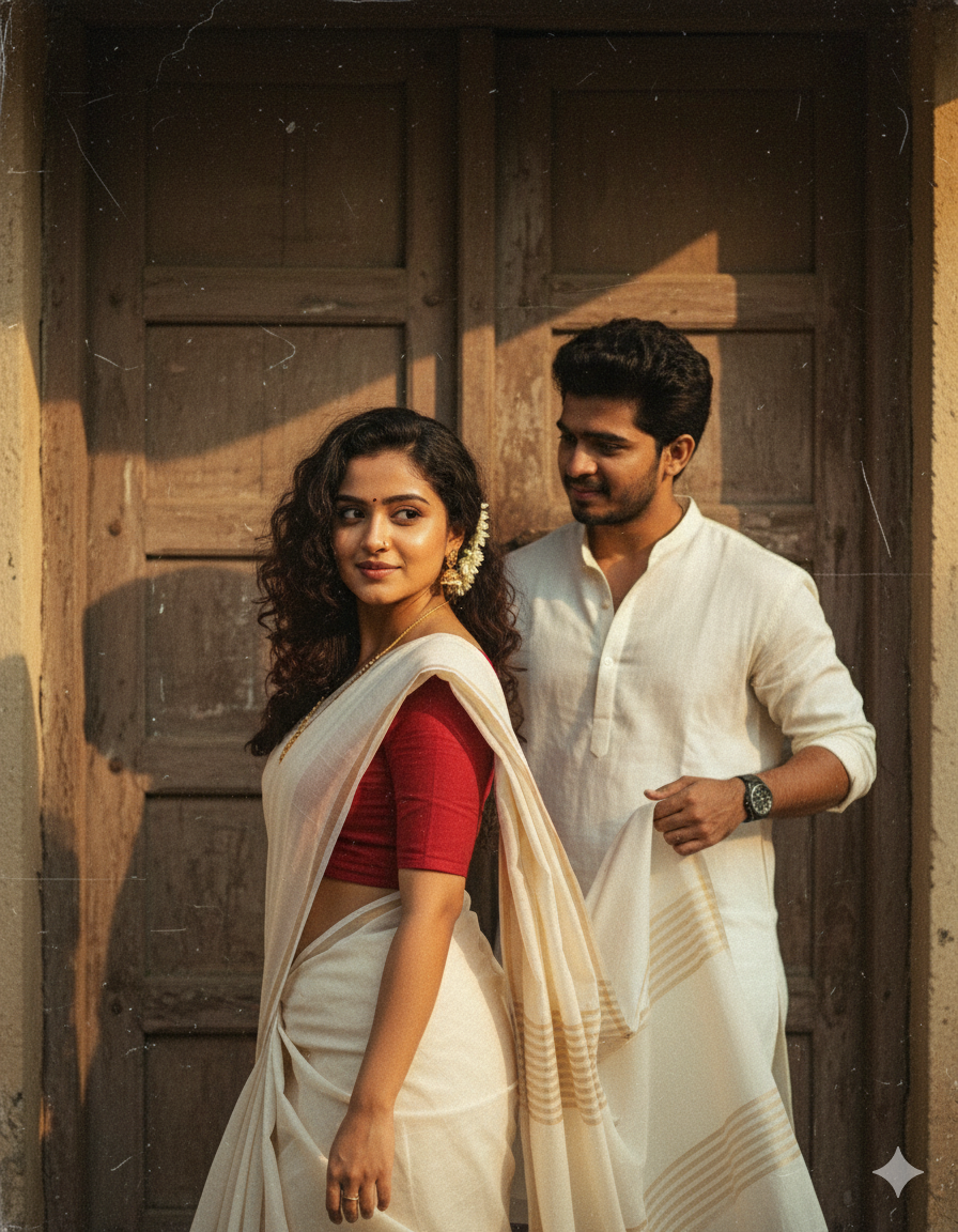 First ask me to upload my selfie. Then Create a retro, vintage - inspired image-grainy yet right- based on the reference picture Triea the google gemini as a couple The girl should be draped in a perfect Off white cotton saree With a red blouse. Pinterest styles aesthetic saree. The vibe must capture the essence of a 90s movie dark brown -haired baddie, enhanced by a windy, romantic atmosphere and the guy should be wearing an off white shirt kurta. She stands against an old wooden door, where deep shadows and dramatic contrast add mystery and artistry to the scene, creating a moody yet enchanting cinematic effect. Make the girl pose like she's walking and looking back while the guys is holding her saree pallu very evidently and the guy should be looking at the girl.
