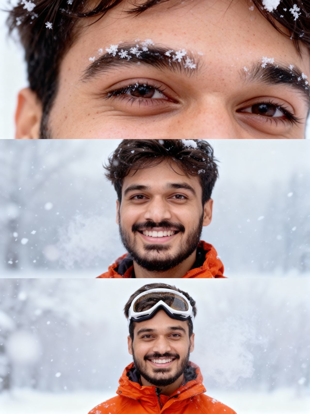 Create a 9:16 vertical cinematic composite divided into 3 stacked frames of the same young man in a winter snowfall scene. His face must match the uploaded reference photo 100% — same jawline, eyes, nose, lips, eyebrows, hair volume, and natural skin texture. Keep his bright, genuine big smile exactly like in the reference image. Top Frame: Extreme close-up of his smiling eye and cheek, snowflakes resting softly on his lashes and hair. Middle & Bottom Frame: Medium and full shots of him standing in snowfall, smiling warmly and naturally, breath visible in cold air.