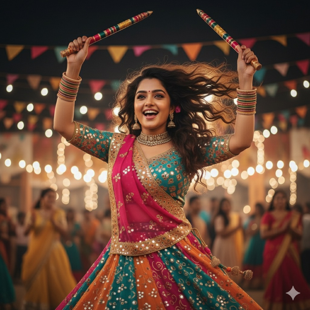 cinematic portrait of a young Indian woman during Navratri festival, wearing a traditional colorful Bandhani dupatta with intricate patterns, silver jhumkas, and bangles. She holds a dandiya stick gracefully in her hands. Her long wavy hair flows naturally, glowing softly in warm golden hour lighting. Festive lights twinkle in the blurred background, creating a dreamy and cultural celebration atmosphere. Ultra realistic, high detail, cinematic photography style.