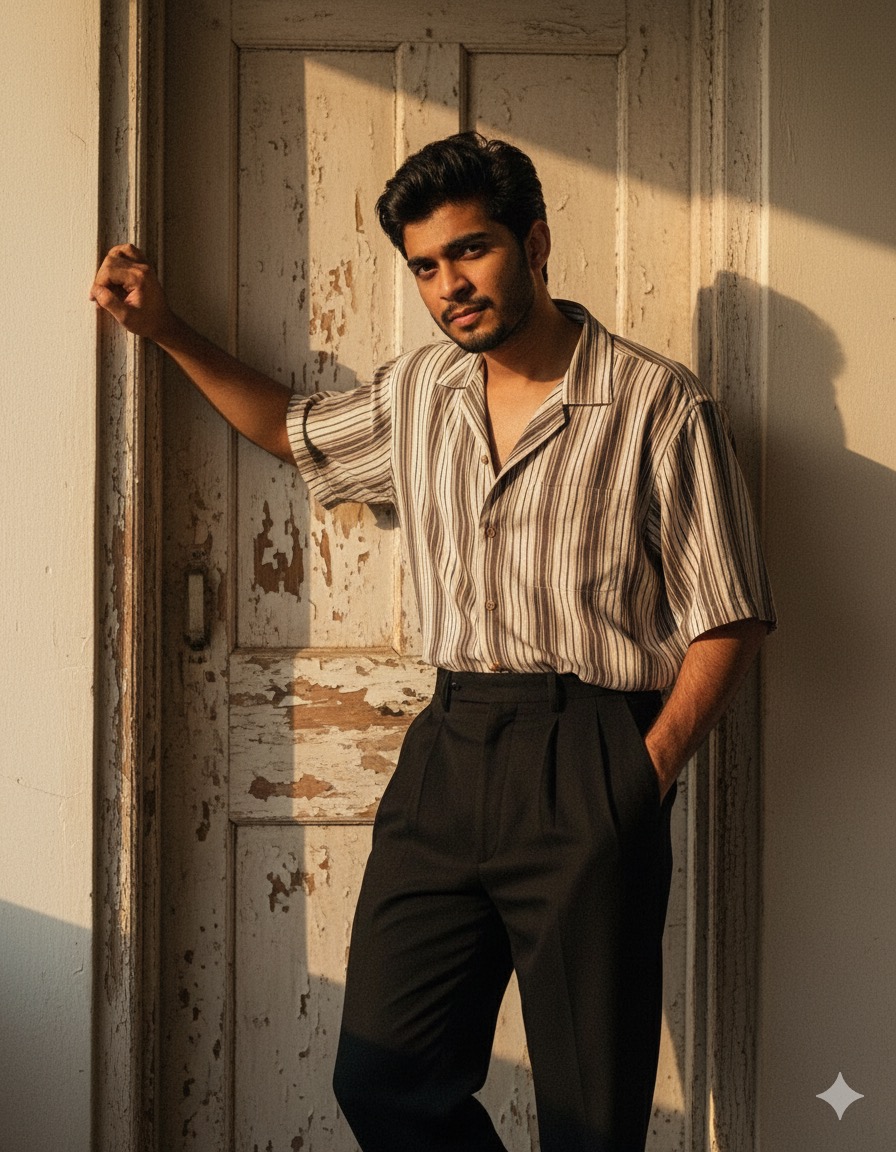 A South Asian man standing against a warm beige wall, dressed in a relaxed yet elegant outfit: an off-white linen shirt with rolled-up sleeves and slightly unbuttoned collar, tucked into high-waisted beige trousers with a belt. The lighting is soft and golden, casting dramatic shadows across the wall for a cinematic effect. His pose is calm and introspective, with one hand in his pocket and head slightly tilted down, giving a thoughtful and stylish atmosphere.