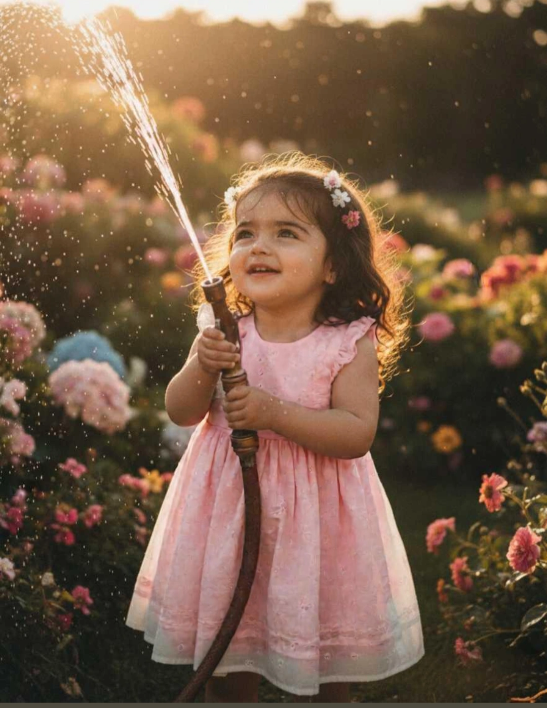 Create a retro vintage grainy but bright image of the reference picture, without changing the face, but dressed in a soft white summer dress KNEE LENGTH with delicate frills. The3.5-year-old baby girl is playing in a beautiful garden surrounded by flowers, greenery, and gentle sunlight. Her shoulder length curly hair flows naturally with a few tiny flowers tucked in, giving a dreamy and innocent charm. The atmosphere should feel whimsical and magical, with soft shadows, bright light, and a nostalgic, artistic aesthetic. Her pose should suggest that she is spraying water upwards in a hose pipe and playing, where deep shadows and dramatic contrasts add mystery and artistry to the scene, creating a moody yet enchanting cinematic effect. line a sunset or golden our time of the day. Fine droplets of water clearly visible on her face eyelashes and skin making her look radiant and cute in the rain. she can be facing upwards with a naughty and cute expression. the atmosphere is dreamy and vibrant, not dull with a soft golden touch.